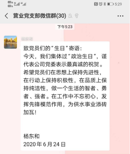 烏海市海勃灣城市供水有限公司為進(jìn)一步增強(qiáng)主題教育的吸引力和感染力,于6月24日開(kāi)展黨員“過(guò)政治生日,憶入黨初心”主題黨日活動(dòng)。五個(gè)黨支部分別在完成奏唱國(guó)歌、重溫入黨誓詞、領(lǐng)誦黨章、繳納黨費(fèi)、學(xué)習(xí)政治理論后為黨員過(guò)“政治生日”。