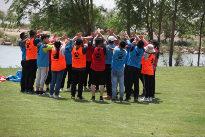 在藍天白云與綠茵鮮花相互映襯著的自然風(fēng)景下,戶外拓展活動正式拉開了序幕。40余名職工分成四組,取隊名、定隊號、定隊歌及設(shè)計隊旗并且用獨特的方式展示出來。