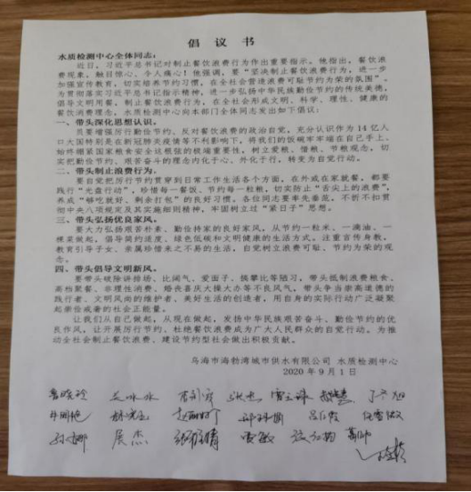 為深入貫徹落實(shí)習(xí)近平總書(shū)記的重要指示精神,示范帶動(dòng)公司形成“厲行節(jié)約、反對(duì)浪費(fèi)”的良好風(fēng)尚。海勃灣城市供水公司水質(zhì)檢測(cè)中心發(fā)起了“厲行節(jié)儉,杜絕浪費(fèi)”倡議書(shū)。倡議書(shū)主要內(nèi)容是從現(xiàn)在開(kāi)始,從生活習(xí)慣做起,在細(xì)微之中爭(zhēng)做勤儉節(jié)約的傳播者、踐行者和示范者,用實(shí)際行動(dòng)展現(xiàn)出理性消費(fèi),節(jié)約勤儉的良好社會(huì)風(fēng)尚,共同為建設(shè)文明、和諧、環(huán)保的社會(huì)環(huán)境作出應(yīng)有的貢獻(xiàn)!
