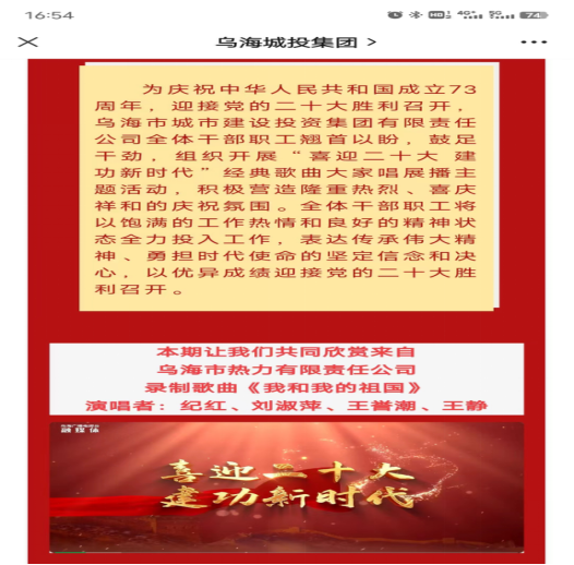 在黨中央確定今年下半年召開黨的二十大之后,市城投集團(tuán)公司將喜迎黨的二十大作為2022年思政宣傳工作的重要主線,將其貫穿到企業(yè)經(jīng)營和生產(chǎn)服務(wù)工作全過程,組織策劃喜迎二十大系列活動,先后開展市城投集團(tuán)公司“踔厲奮發(fā)新征程,迎接黨的二十大”我們的節(jié)日?中秋主題活動,組織黨員干部職工觀看紅色影片,組織開展“喜迎二十大 建功新時代”經(jīng)典歌曲大家唱展播活動,各子公司營業(yè)廳、辦公樓等場所張貼懸掛喜迎黨的二十大宣傳標(biāo)語等,進(jìn)一步統(tǒng)一思想、凝聚共識、匯聚力量,在干部群眾中引起熱烈反響,全面營造迎接黨的二十大的濃厚氛圍,以實際行動迎接黨的二十大勝利召開。
