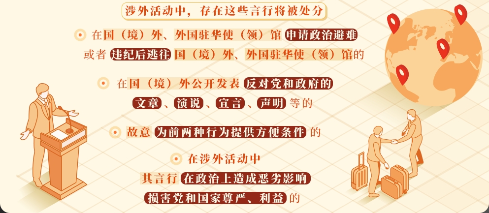涉外活動關系黨和國家的尊嚴和榮譽,具有很強的政治性。《中國共產黨紀律處分條例》第七十二條、七十三條對涉外活動中存在有政治問題的言行作了處分規(guī)定,主要有以下幾類:1.在國(境)外、外國駐華使(領)館申請政治避難,或者違紀后逃往國(境)外、外國駐華使(領)館的,給予開除黨籍處分。所謂“申請政治避難”,一般指黨員以所謂“政治原因”為借口,逃往國(境)外或外國駐華使(領)館,申請取得居留權并居住在國(境)外或者外國駐華使(領)館?!斑`紀后逃往國(境)外、外國駐華使(領)館的”,一般指違紀黨員為逃避紀律處分,逃往國(境)外、外國駐華使(領)館。無論是向外國申請政治避難,還是違紀后逃往國(境)外,都表明該黨員已徹底背叛黨的事業(yè),喪失了共產黨員條件,應當給予開除黨籍處分。2.在國(境)外公開發(fā)表反對黨和政府的文章、演說、宣言、聲明等的,給予開除黨籍處分。黨員在國(境)外公開發(fā)表反對黨和政府的言論,同樣表明其已徹底背叛了黨的事業(yè),喪失了共產主義信仰和共產黨員應具備的條件,應當受到最嚴厲的紀律處分。3.故意為前兩種行為提供方便條件的,給予留黨察看或者開除黨籍處分?!疤峁┓奖銞l件”,主要指為申請政治避難、外逃或者在國(境)外公開發(fā)表反動言論等提供各種有利條件,如為其開具證明、代辦護照簽證、幫助購買車船機票、提供經濟幫助、提供落腳點、提供發(fā)表反動言論的平臺,等等。4.在涉外活動中,其言行在政治上造成惡劣影響,損害黨和國家尊嚴、利益的,給予撤銷黨內職務或者留黨察看處分;情節(jié)嚴重的,給予開除黨籍處分。此類違紀行為包括兩個條件:一是該行為發(fā)生在涉外活動中;二是在政治上造成惡劣影響,損害黨和國家尊嚴、利益。無論什么時候,黨員干部都要切實增強政治敏銳性,在涉外活動中以良好精神風貌和舉止言行維護黨和國家形象,堅決防范有政治問題的言行。