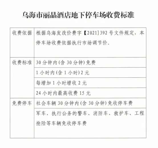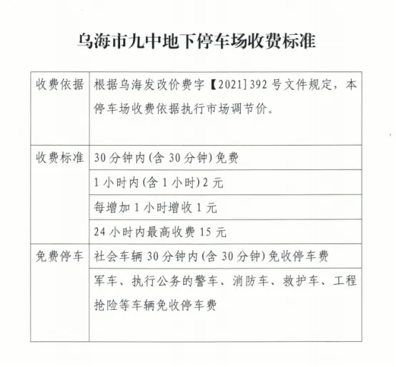為緩解地面停車壓力,引導(dǎo)車輛有序停放,烏海市濱河九中地下停車場與麗晶國際酒店地下停車場已完成智能化升級改造。2024年7月25日經(jīng)海勃灣區(qū)城市管理綜合執(zhí)法局批準(zhǔn),兩個停車場于近期正式開展停車收費管理,收費標(biāo)準(zhǔn)見下表: