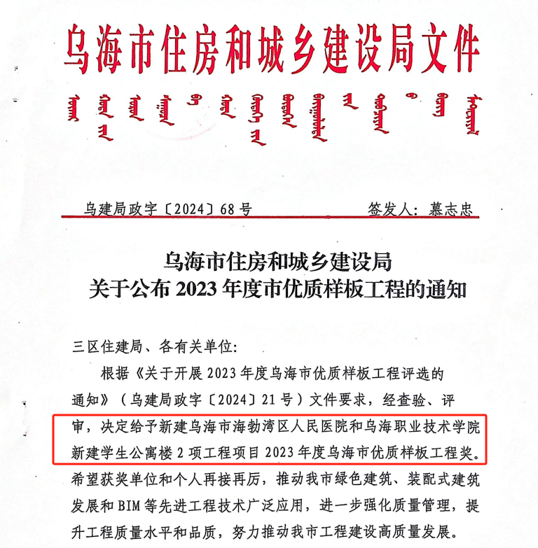 近日,烏海市住房和城鄉(xiāng)建設局發(fā)布了《關于公布2023年度市優(yōu)質樣板工程的通知》名單,由城建公司承建的烏海市職業(yè)技術學院新建學生公寓樓項目榮獲2023年度烏海市優(yōu)質樣板工程獎。