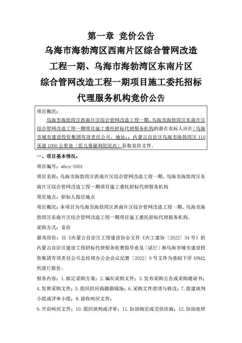 烏海市海勃灣區(qū)西南片區(qū)綜合管網(wǎng)改造工程一期、烏海市海勃灣區(qū)東南片區(qū)綜合管網(wǎng)改造工程一期項目施工委托招標代理服務(wù)機構(gòu)競價公告
