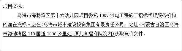 項目名稱:烏海市海勃灣區(qū)第十六幼兒園項目委托10KV供電工程施工招標代理服務機構(gòu)