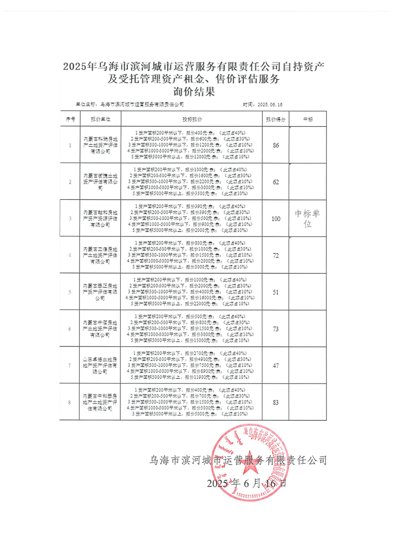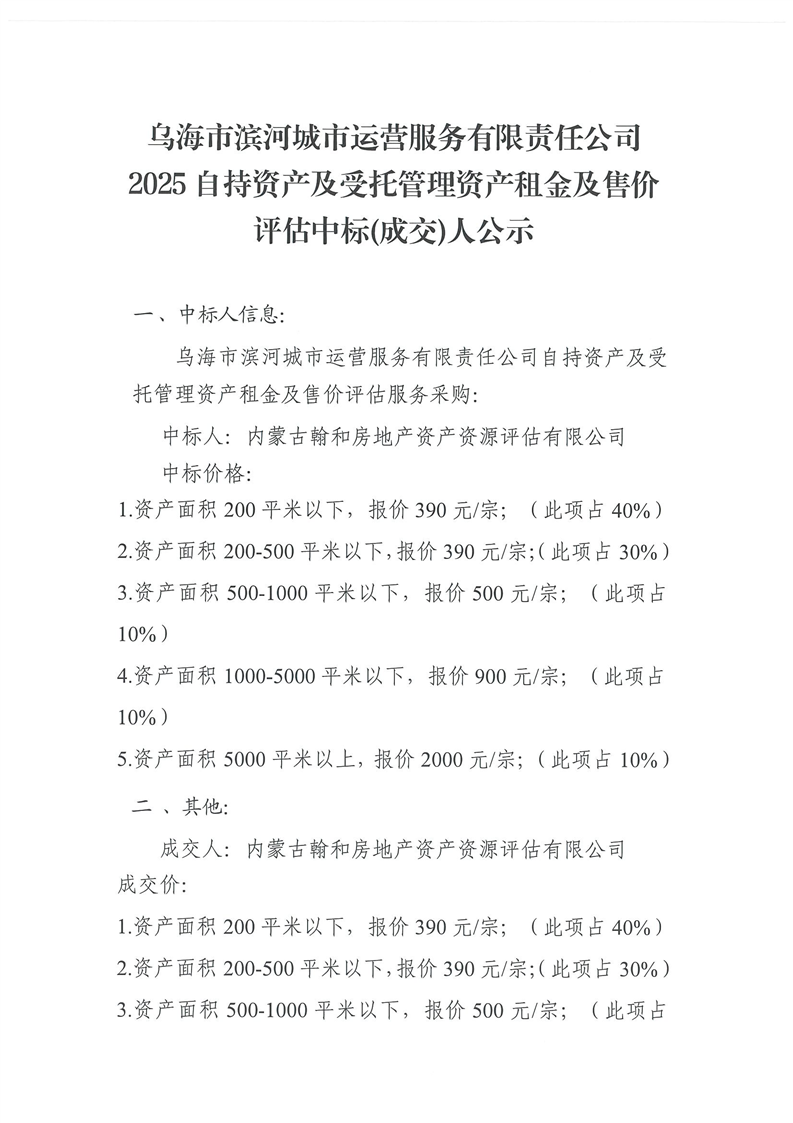 烏海市濱河城市運(yùn)營(yíng)服務(wù)有限責(zé)任公司2025自持資產(chǎn)及受托管理資產(chǎn)租金及售價(jià)評(píng)估中標(biāo)(成交)人公示