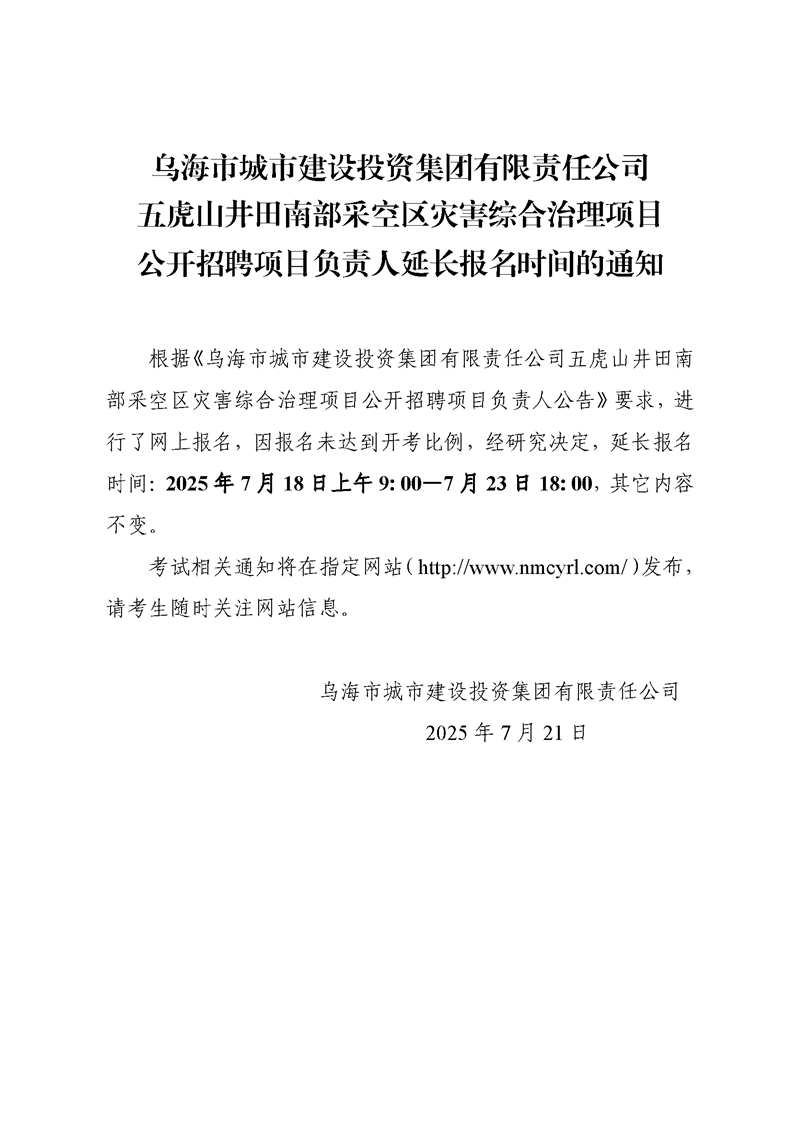 烏海市城市建設(shè)投資集團有限責(zé)任公司五虎山井田南部采空區(qū)災(zāi)害綜合治理項目公開招聘項目負(fù)責(zé)人延長報名時間的通知