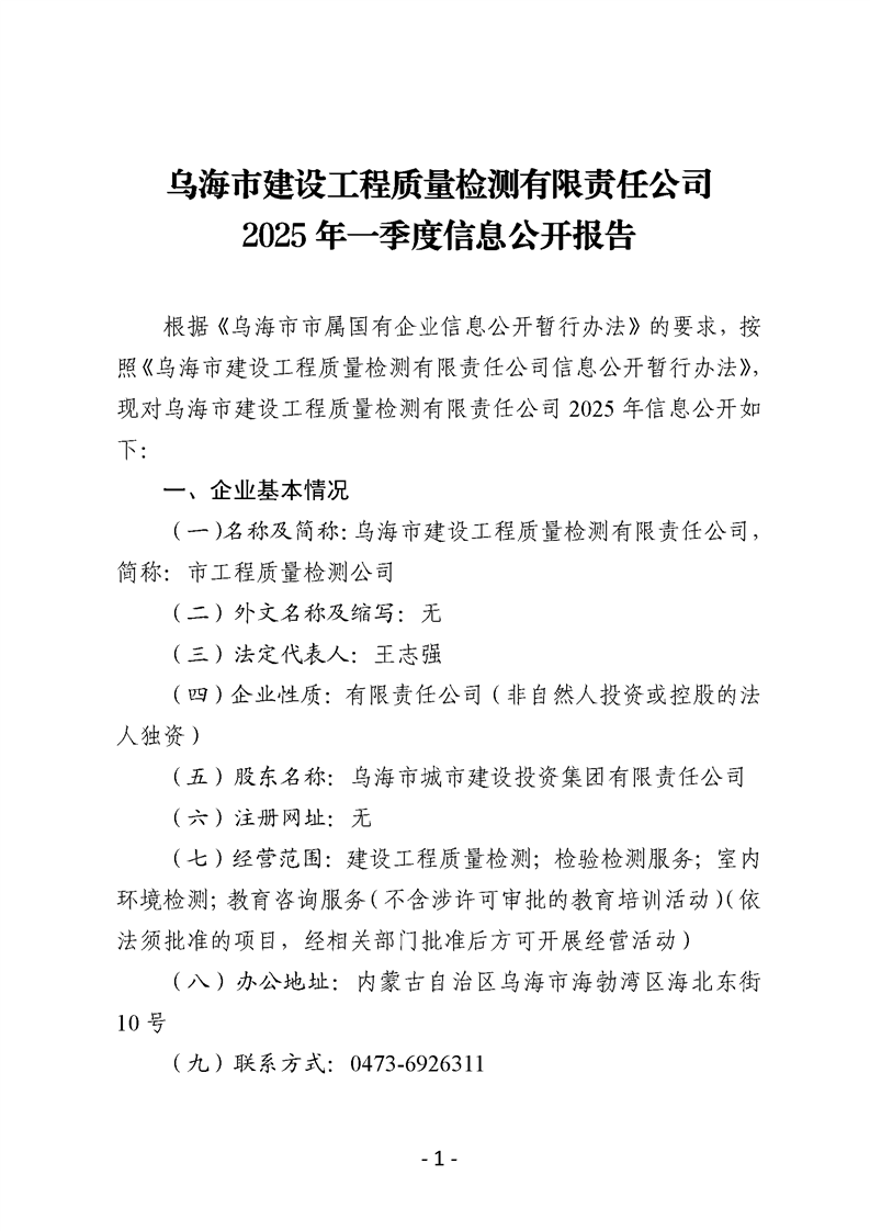 - 2025-07-28烏海市建設(shè)工程質(zhì)量檢測有限責任公司2025年二季度信息公開