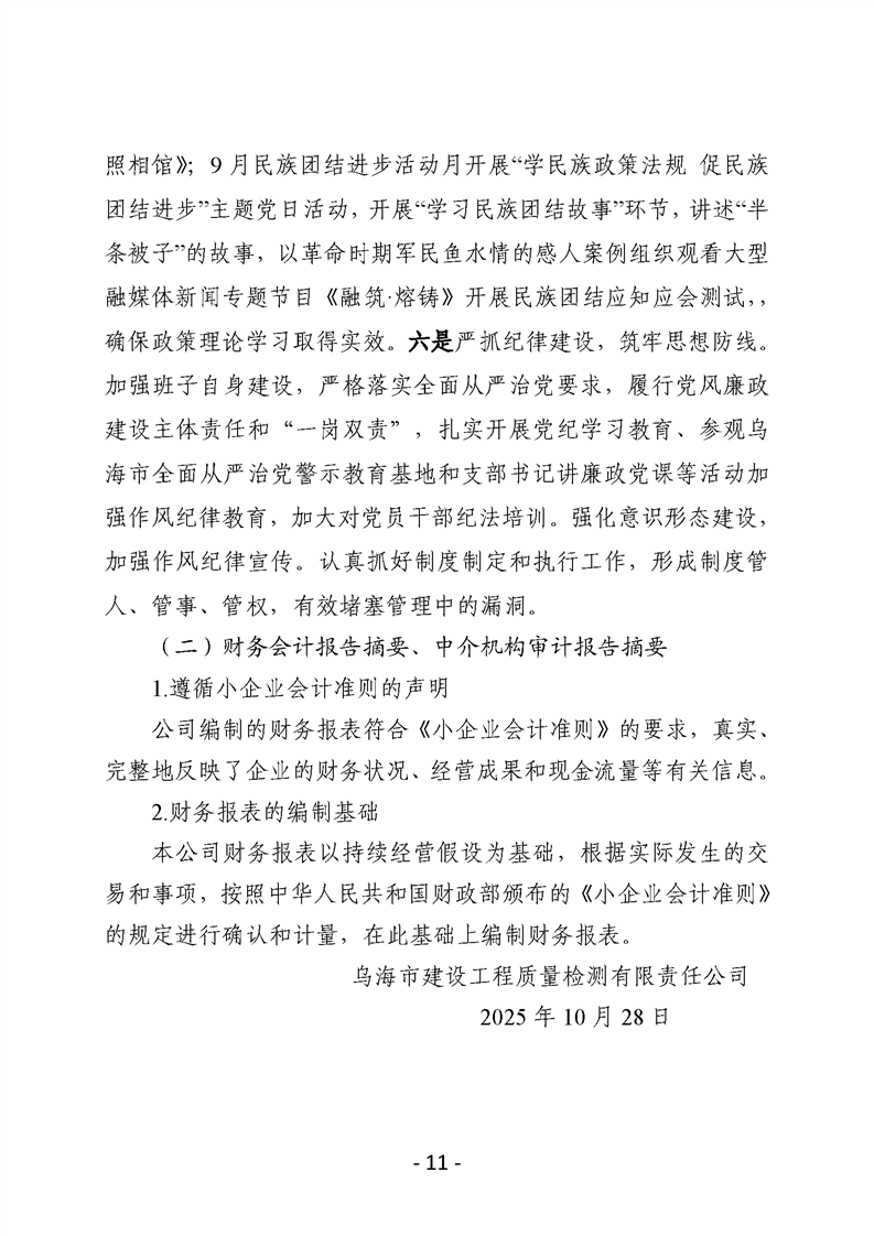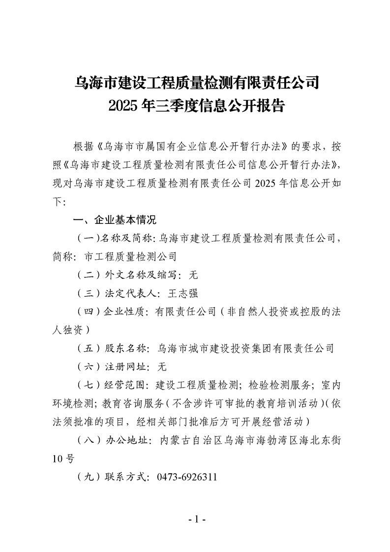 烏海市建設(shè)工程質(zhì)量檢測(cè)有限責(zé)任公司2025年三季度信息公開