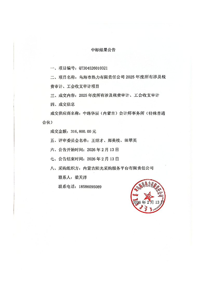 烏海市熱力有限責(zé)任公司2025年度所有涉及稅費(fèi)審計(jì)、工會(huì)收支審計(jì)采購(gòu)項(xiàng)目結(jié)果公示