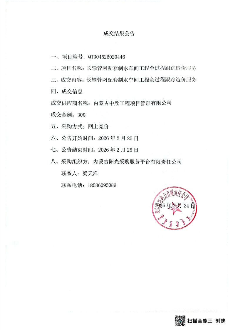 長(zhǎng)輸管網(wǎng)配套制水車間工程全過程跟蹤造價(jià)服務(wù)成交結(jié)果公告