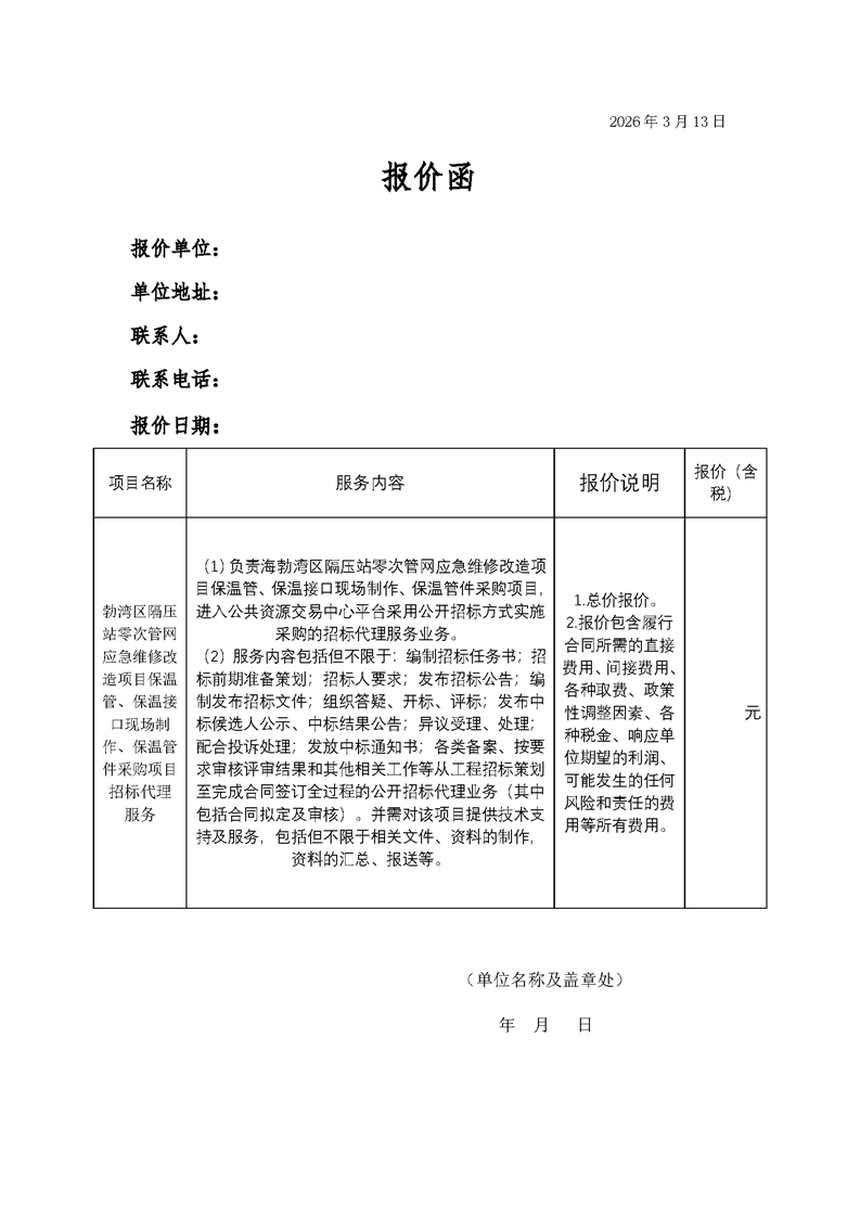 勃灣區(qū)隔壓站零次管網應急維修改造項目保溫管、保溫接口現場制作、保溫管件采購項目招標代理服務【招標公告】