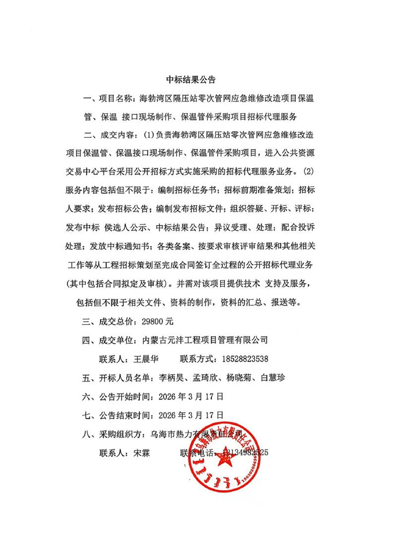海勃灣區(qū)隔壓站零次管網(wǎng)應急維修改造項目保溫管、保溫 接口現(xiàn)場制作、保溫管件采購項目招標代理服務(結果公告)