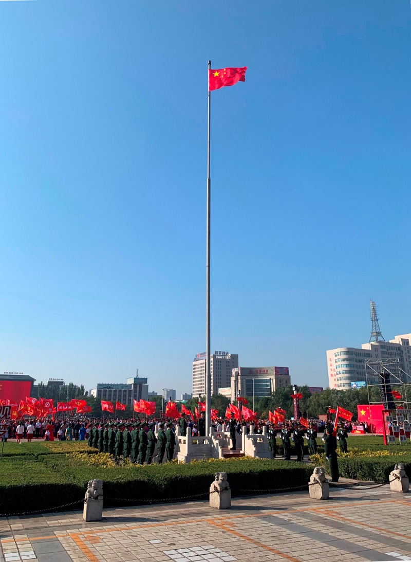 上午9時整,莊嚴(yán)的升國旗儀式正式開始。護旗隊隊員精神抖擻,邁著矯健有力的步伐,護衛(wèi)著五星紅旗走向升旗臺。在雄壯的《義勇軍進行曲》中,鮮艷的五星紅旗徐徐展開、冉冉升起、迎風(fēng)飄揚。我公司參與人員整齊列隊、行注目禮、高唱國歌,向偉大祖國致以崇高敬意和美好祝愿。